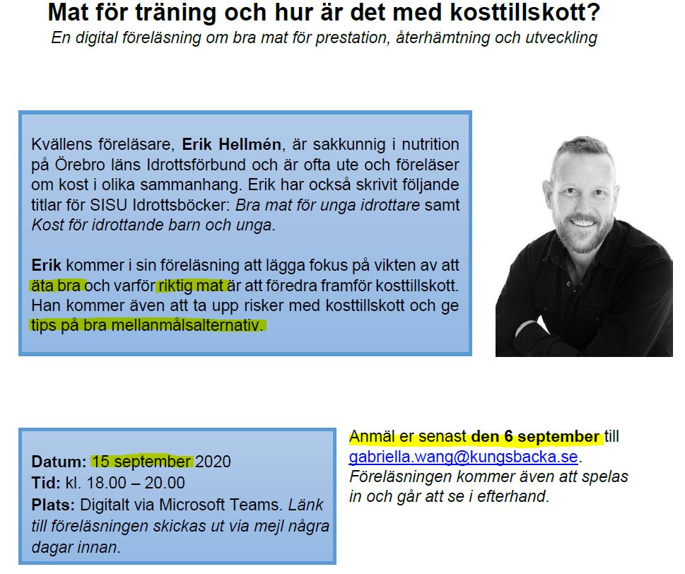 Toppen att få tips på mat som är bra och rätt! Passa på att anmäl Er till denna digitala föreläsningen. Anmäl er senast den 6 september till: