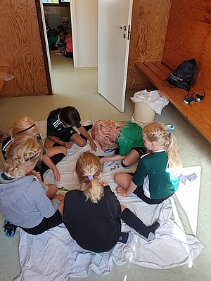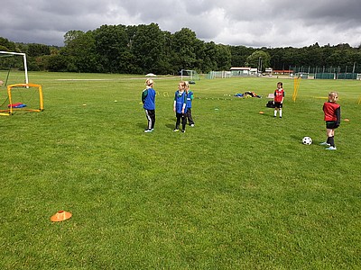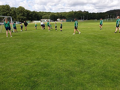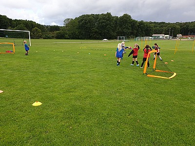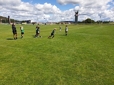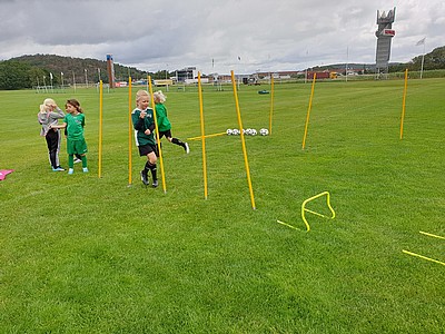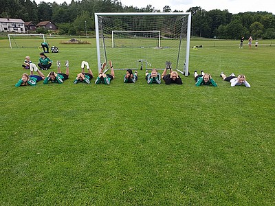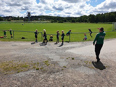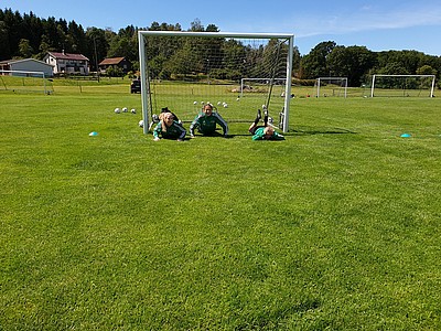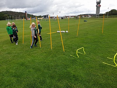 De stora tjejerna fick bekänna färg när de dels skulle visa hur man trixar och sedan var det dax att spela match (på vårat vis) i början ska man ligga med händerna på huvet och benen på ryggen, sedan får man inte springa innan tränaren säger "KÖR" inte gå, inte köra utan KÖR. Det var svårt för de stora som mest skrattade och en liten groda var på väg ur munnen 😂